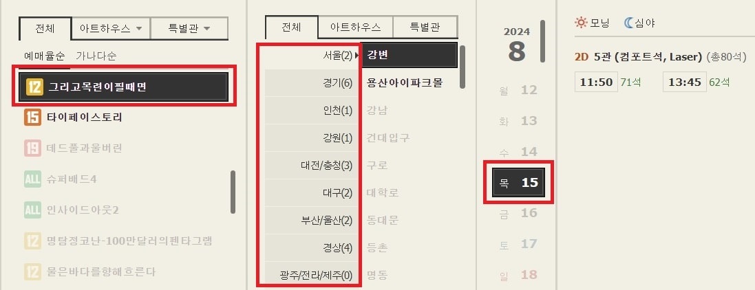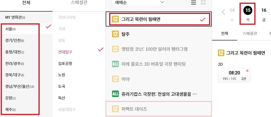 이곳에서는, 15일 개봉일 기준 CGV, 롯데시네마, 메가박스 상영관을 소개해 드리오니 15일 이후 상영일정& 상영관은 아래 각 영화관 페이지로 들어가신 후 "예매"를 누르시면 날짜 별로 바로 확인이 가능합니다.