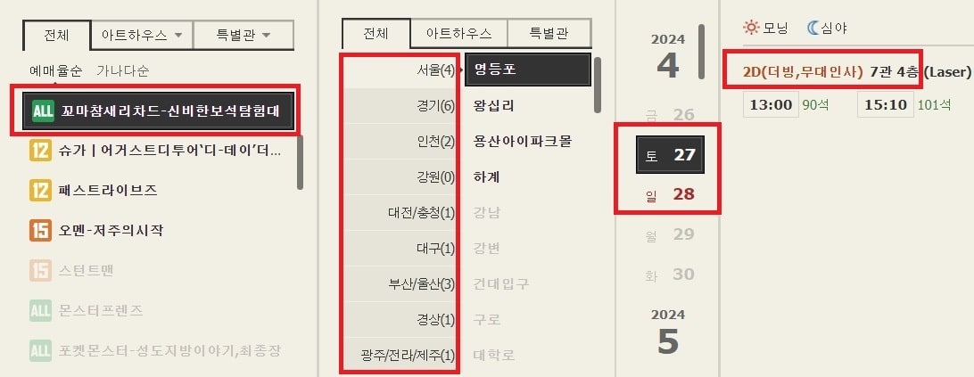 CGV에서는 현재 무대인사 및 프리미어 상영이 27일(토)~28일(일) 이루어지고 있는데, 두 날짜 모두 상영 영화관은 동일합니다.