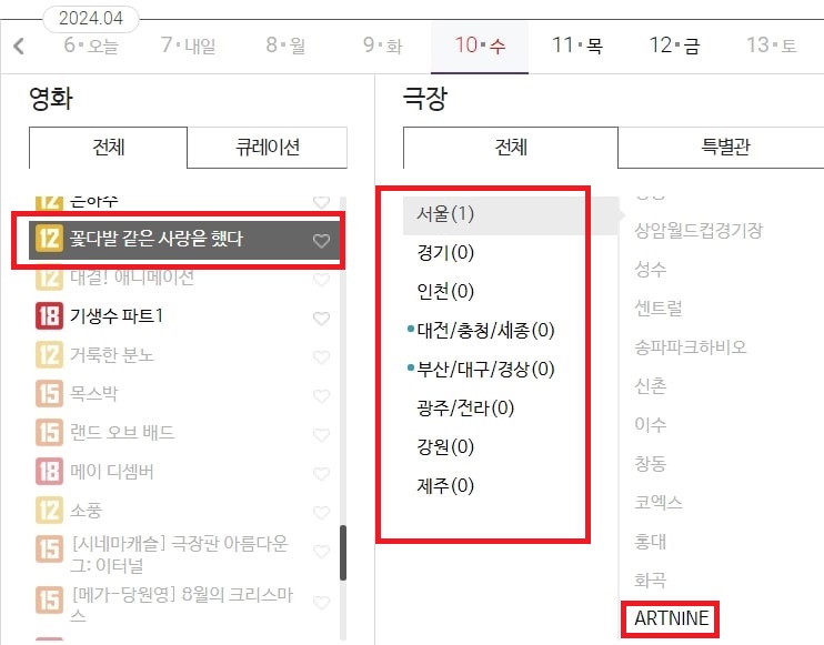 메가박스에서는 10일 서울 ARTNINE 메가박스 1곳에서만 상영하는 것으로 나타납니다. 이후 자세한 일정 및 상영관 소식은 영화페이지에서 확인하시면 될 거 같습니다.