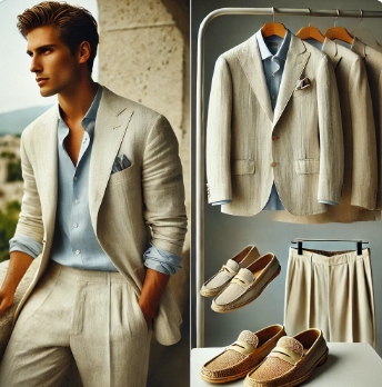 여름철 결혼식에서는 무더운 날씨 때문에 의상 선택에 더욱 신경 써야 합니다. 이때는 린넨이나 면 소재와 같이 가벼운 정장이 적합합니다. 베이지나 연한 블루 같은 밝은 색상을 선택하면 시원하고 경쾌한 느낌을 줄 수 있습니다. 통기성이 좋은 셔츠를 매치하고, 밝은 색상의 로퍼를 선택하면 더운 날씨에도 산뜻한 룩을 연출할 수 있습니다.