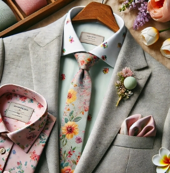 봄철 결혼식은 따뜻해지는 기온을 고려하여 가벼운 소재의 정장을 선택하는 것이 좋습니다. 라이트 그레이나 베이지 컬러의 정장에 파스텔 톤 셔츠를 매치하면 밝고 생동감 있는 느낌을 줄 수 있습니다. 플로랄 패턴의 넥타이나 포켓 스퀘어를 추가해 봄의 분위기를 더욱 살릴 수 있습니다.