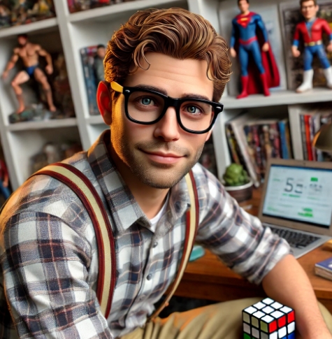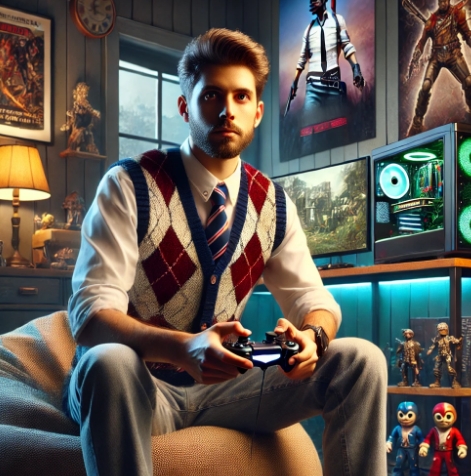 예시: 레트로 게임기를 수집하며, 그에 대한 열정을 친구들과 공유하는 모습, 일반적인 정장 대신 자신만의 스타일을 반영한 개성 있는 옷차림.