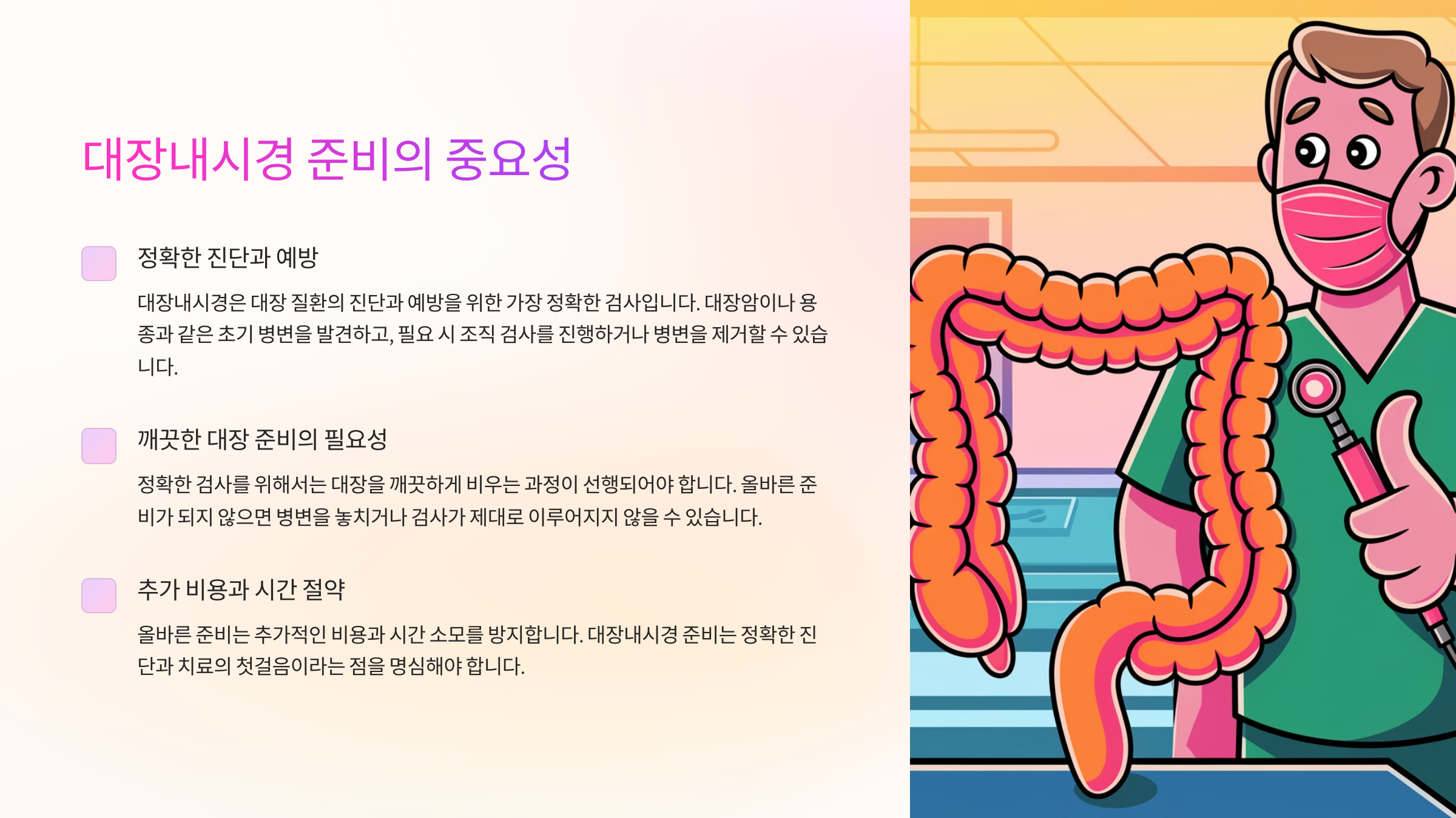 더 나아가 검사 후 추가적인 비용과 시간을 소모하게 될 수 있습니다. 따라서 대장내시경 준비는 단순한 검사를 넘어 정확한 진단과 치료의 첫걸음이라는 점을 명심해야 합니다.