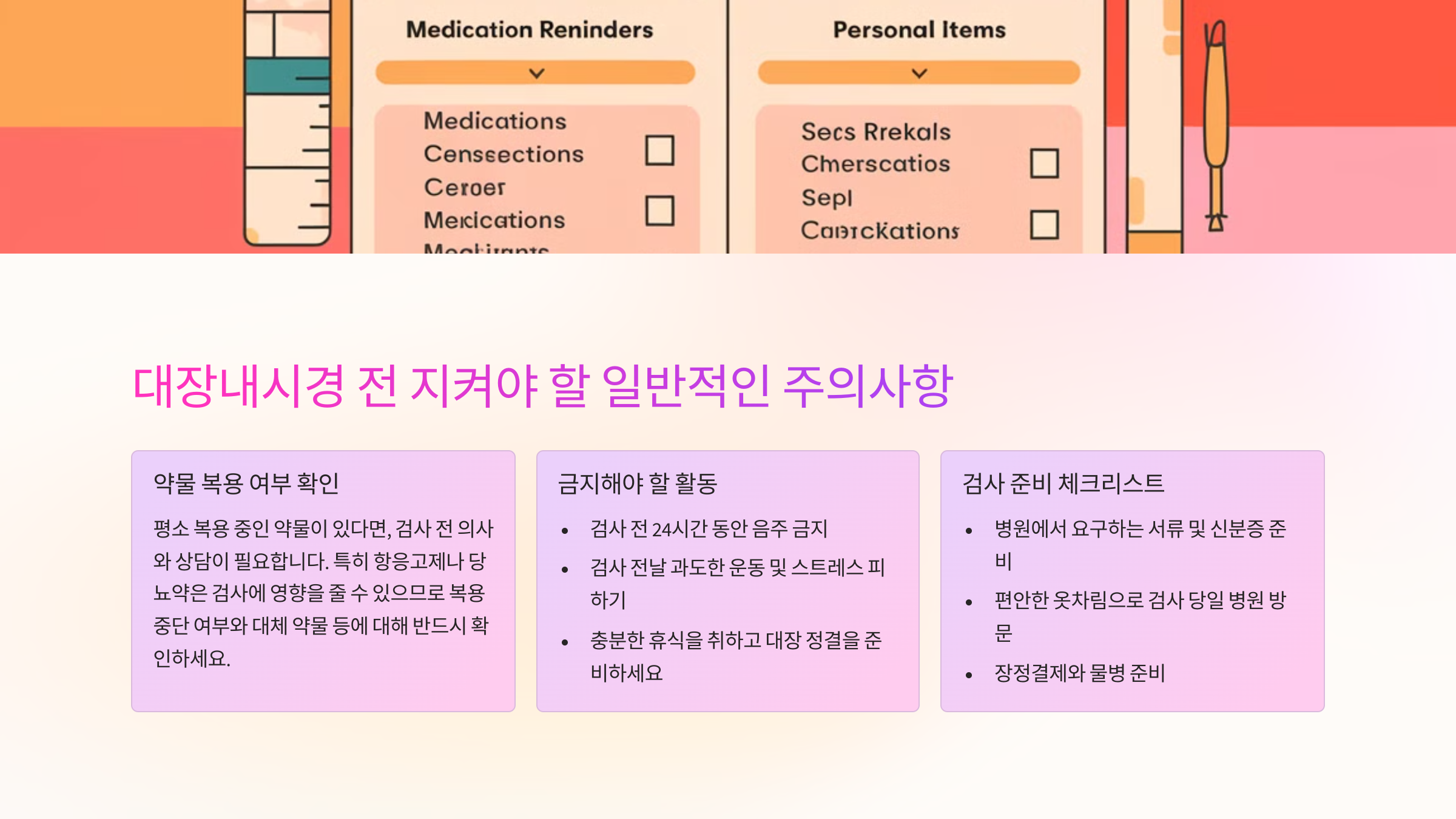 - 충분한 휴식을 취하고 대장 정결을 준비하세요.