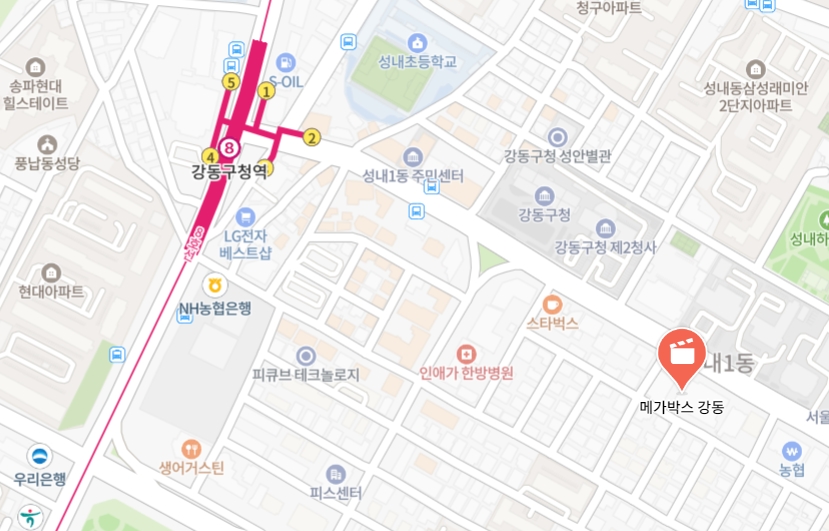 메가박스 강동은 서울특별시 강동구 성내로 1길 5에 위치해 있어 접근성이 뛰어나며, 강동구청역에서 도보로 약 5분 거리에 위치해 있어 대중교통을 이용하는 관객들에게도 매우 편리합니다.