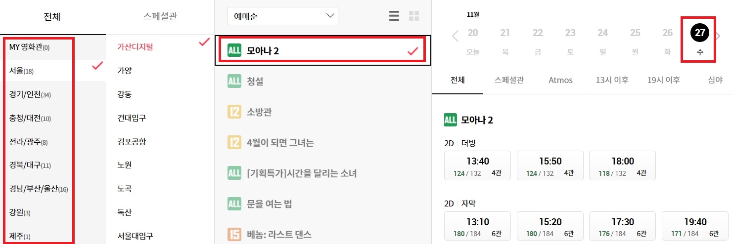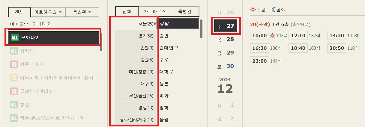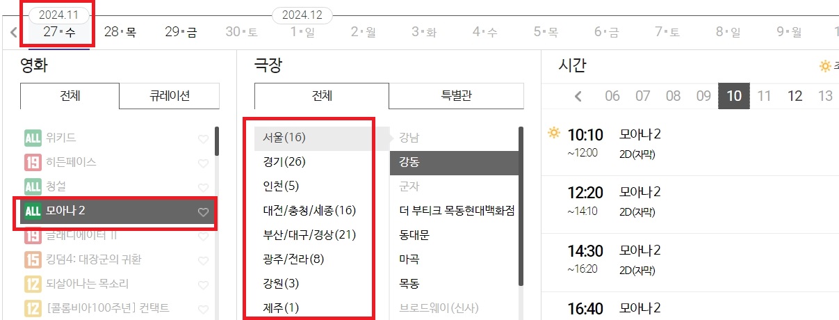 여기에서는, 27일 개봉하는 영화 "모아나 2" cgv, 롯데시네마, 메가박스 서울 상영관을 소개해 드리오니, 서울 외 지역 별 영화관 및 27일 이후 상영일정은 아래 각 영화 페이지로 방문해 "예매"를 선택하시면 자세히 확인할 수 있습니다.