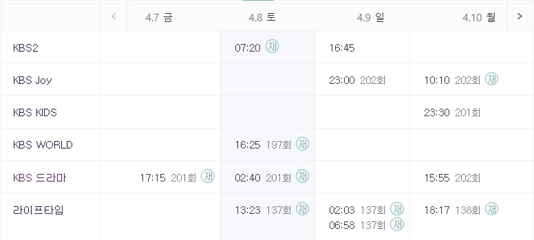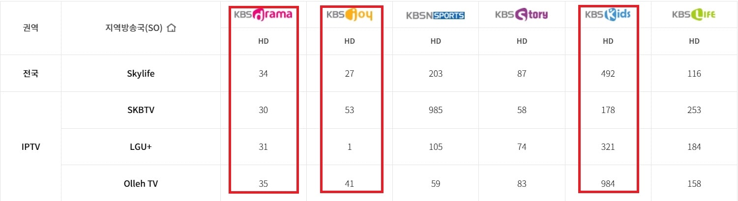 그렇기에 내가 보고싶은 회차가 편성된 채널의 번호를 확인하시고 시청하시면 되는데, KBS(joy, kids, world) 채널번호는 아래 이미지를 통해서 확인하시고 라이프타임은 홈페이지 주소로 방문해 확인하시면 됩니다.
