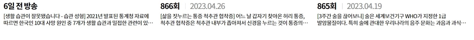 이처럼 이전에 방영되었던 생로병사의 비밀 모든 회차의 방송영상을 시청할 수 있는 주소는 아래 홈페이지 다시 보기로 방문하셔서 보고 싶었던 회차를 찾아 감상하시면 됩니다