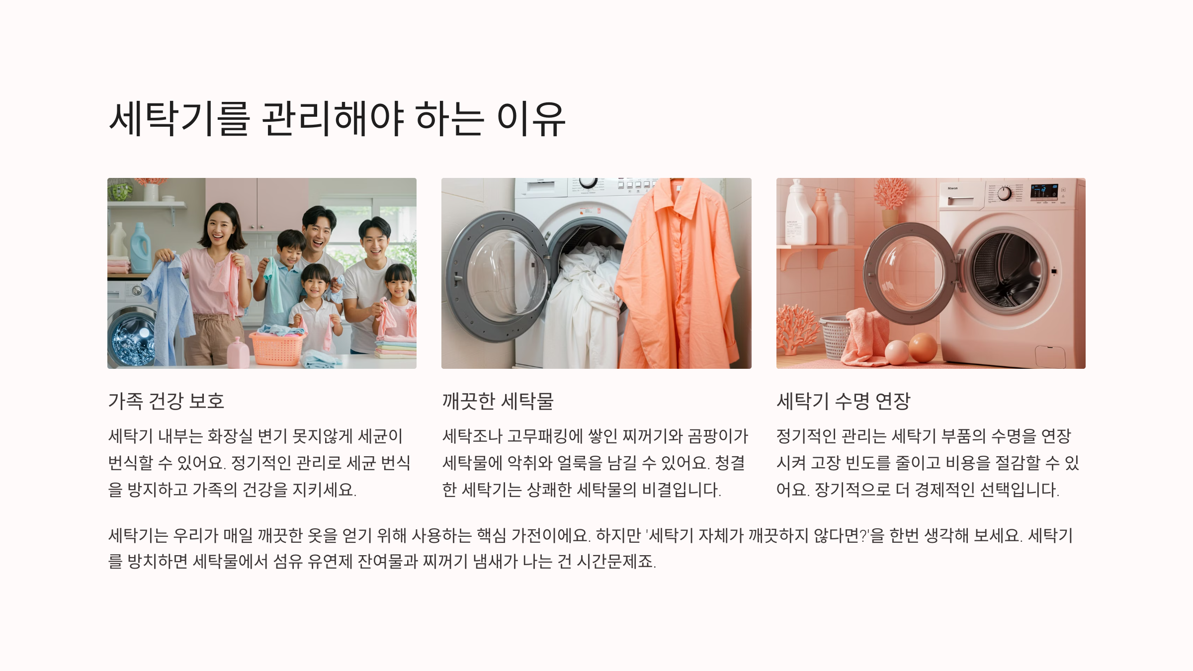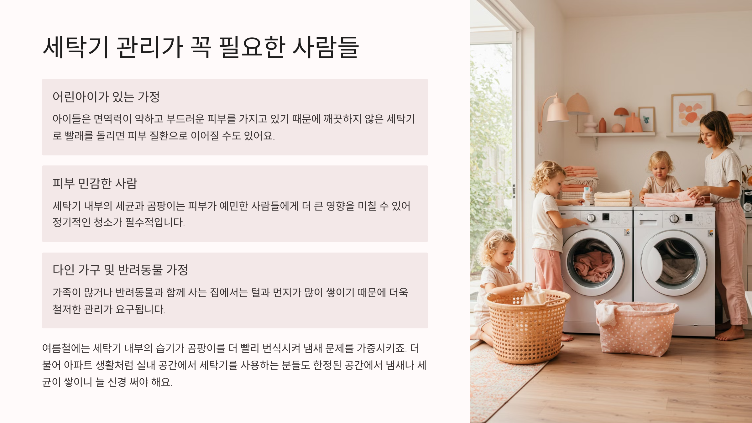 그렇기 때문에 세탁기 관리는 단순히 깨끗함 유지에서 끝나는 것이 아니라, 가족의 건강을 지키는 데 중요한 역할을 합니다.