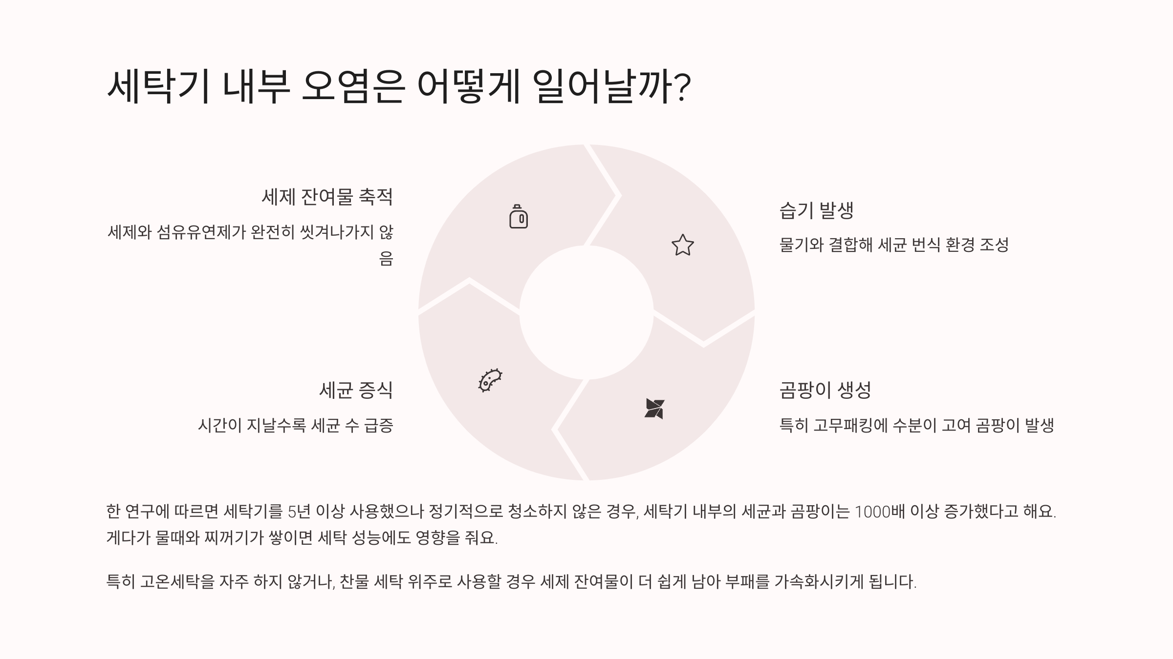 세탁기 내부의 오염은 주로 세제와 섬유유연제의 잔여물이 쌓이면서 시작돼요. 이를 씻어내지 않고 방치하면 물기와 결합해 곰팡이, 세균이 생기기 좋은 환경이 됩니다.
