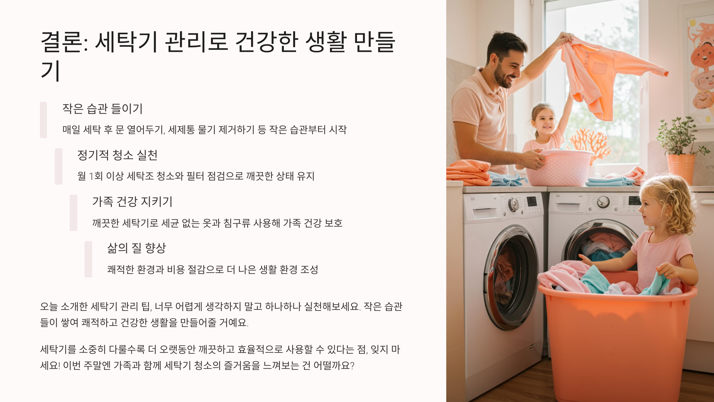 세탁기를 소중히 다룰수록 더 오랫동안 깨끗하고 효율적으로 사용할 수 있다는 점, 잊지 마세요! 이번 주말엔 가족과 함께 세탁기 청소의 즐거움을 느껴보는 건 어떨까요?