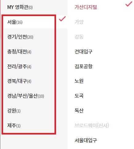 - 서울(16곳): 건대입구, 김포공항, 노원, 도곡, 독산, 서울대입구, 신도림, 신림, 에비뉴엘(명동), 영등포, 용산, 월드타워, 은평(롯데몰), 청량리, 홍대입구