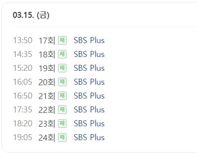 또는 현재 재방송을 편성하고 있는 SBS Plus 채널을 통해 TV 스크린으로 감상하실 수 있으며, 방송 시간은 3월 15일(금)에 17회부터 24회가 13:50, 14:35, 15:20, 16:05, 16:50, 17:35, 18:20, 19:05에 편성되어 있으며 이후 재방송 편성 및 시간은