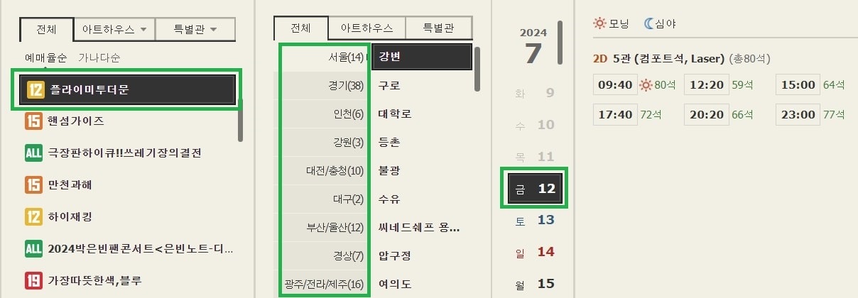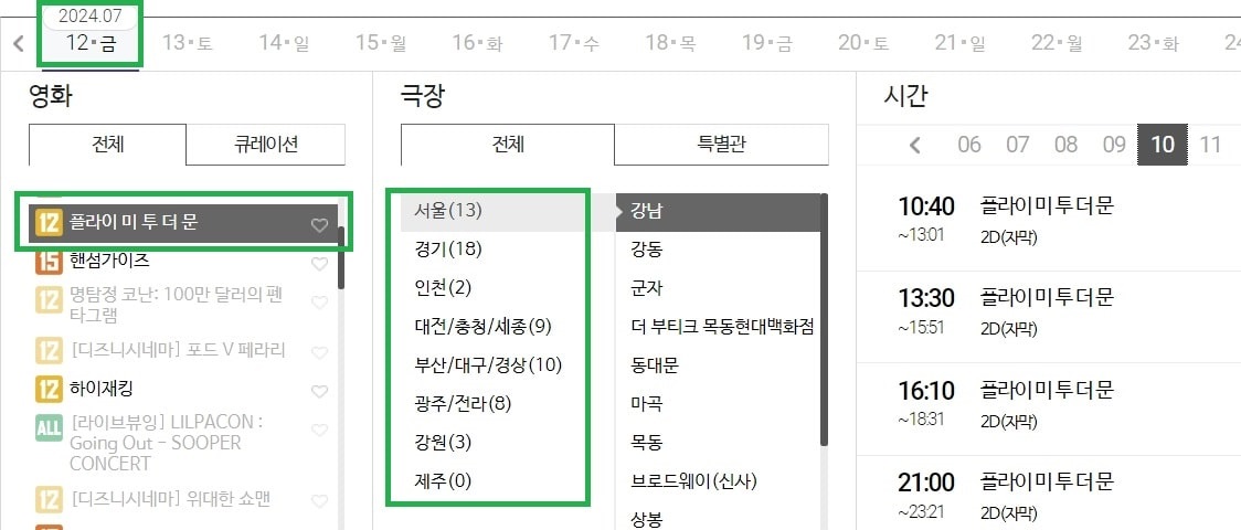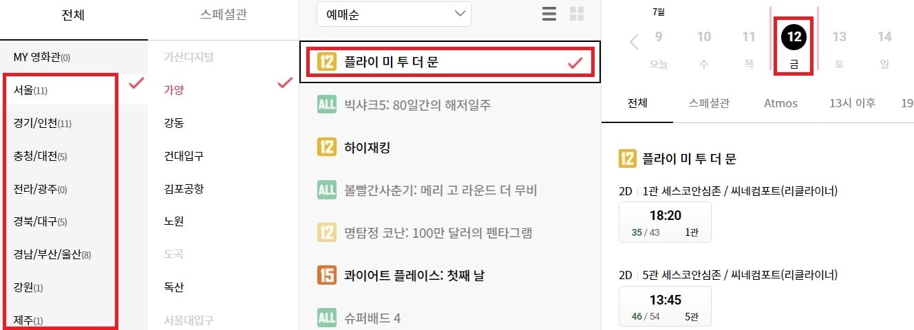 여기에서는 개봉일인 12일(금) 기준으로 영화 플라이 미 투 더 문 일정 및 상영관 소식을 전해 드립니다. 지역 별로 소개하지 못한 개봉관 및 개봉일 이후 일정은 각 영화관 페이지로 방문하셔서 "예매"를 누르시면 확인이 가능합니다.