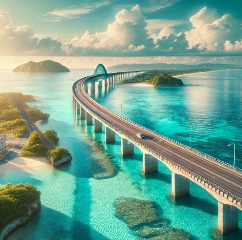코우리대교는 오키나와 본섬과 코우리 섬을 연결하는 긴 다리로, 이곳에서 바라보는 바다 풍경은 오키나와에서 가장 아름다운 절경 중 하나로 꼽힙니다.