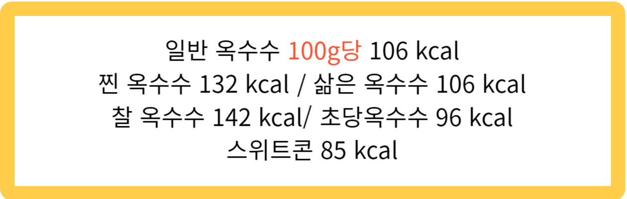 옥수수는 100g당 약 106kcal의 칼로리를 함유하고 있는 이는 210g의 밥 한 공기가 300~310 칼로리를 가지고 있는 것에 비해 적은 양이긴 하지만 다이어트를 하는 분들께는 적지 않은 고민이 될 수 있습니다.