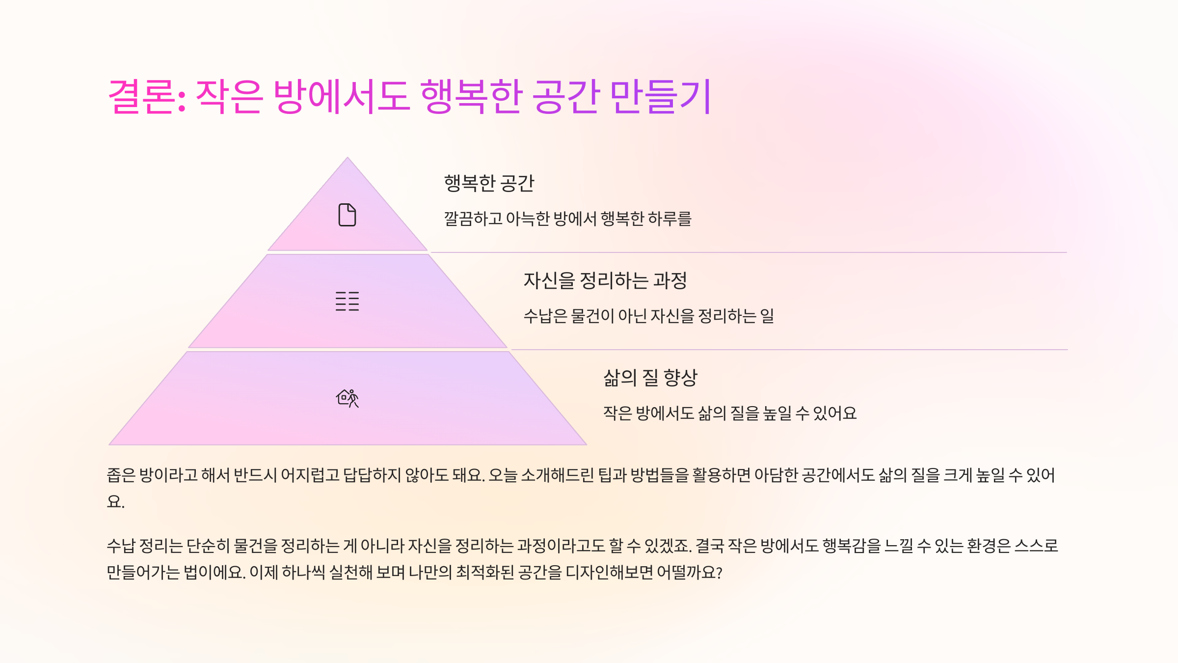 결국 작은 방에서도 행복감을 느낄 수 있는 환경은 스스로 만들어가는 법이에요. 이제 하나씩 실천해 보며 나만의 최적화된 공간을 디자인해 보면 어떨까요?