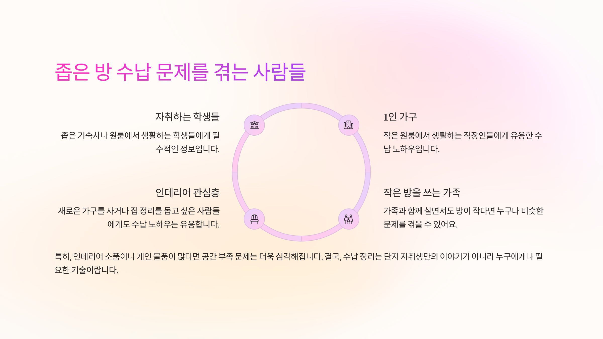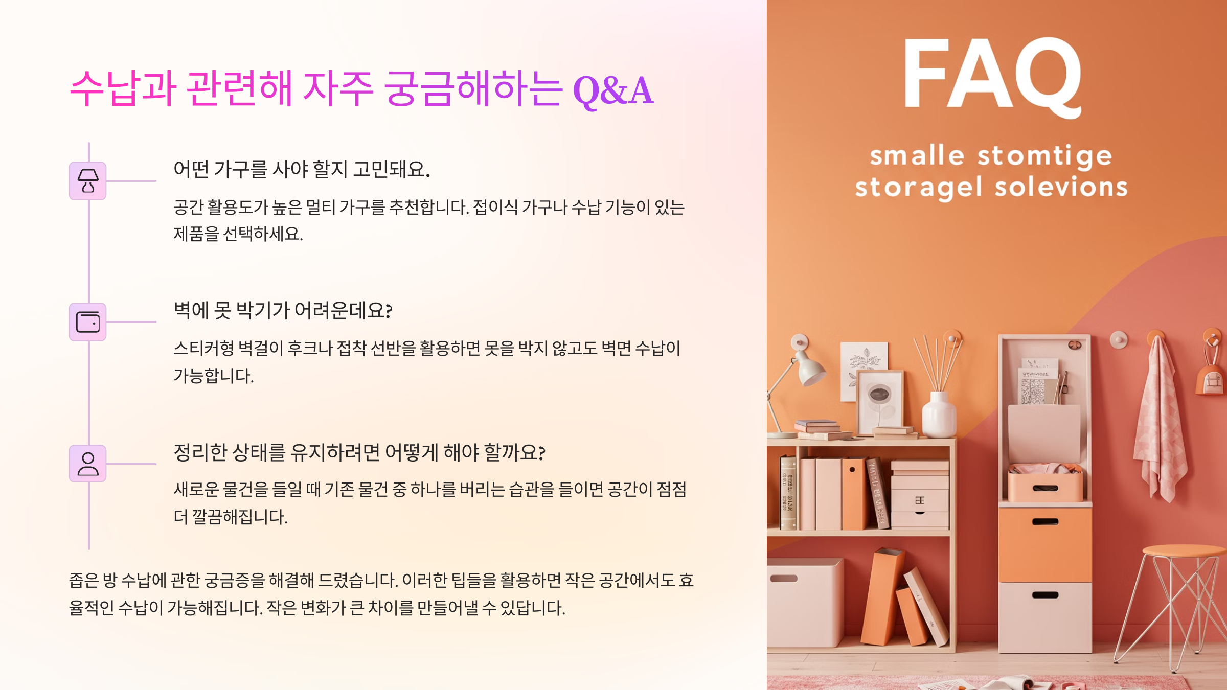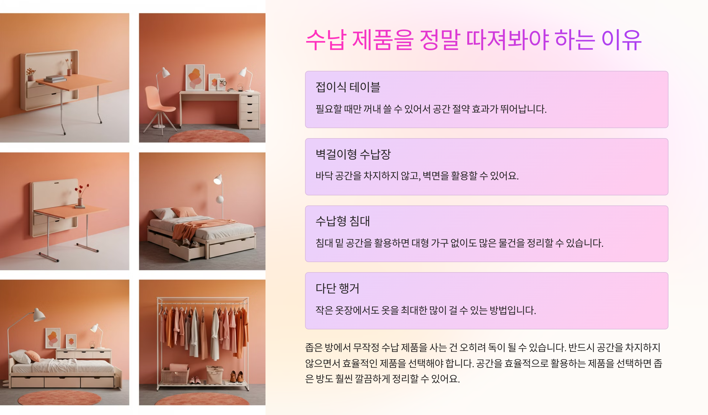가족과 함께 살면서도 방이 작다면 누구나 비슷한 문제를 겪을 수 있어요. 그리고 새로운 가구를 사거나 집 정리를 돕고 싶은 사람들에게도 수납 노하우는 유용합니다.