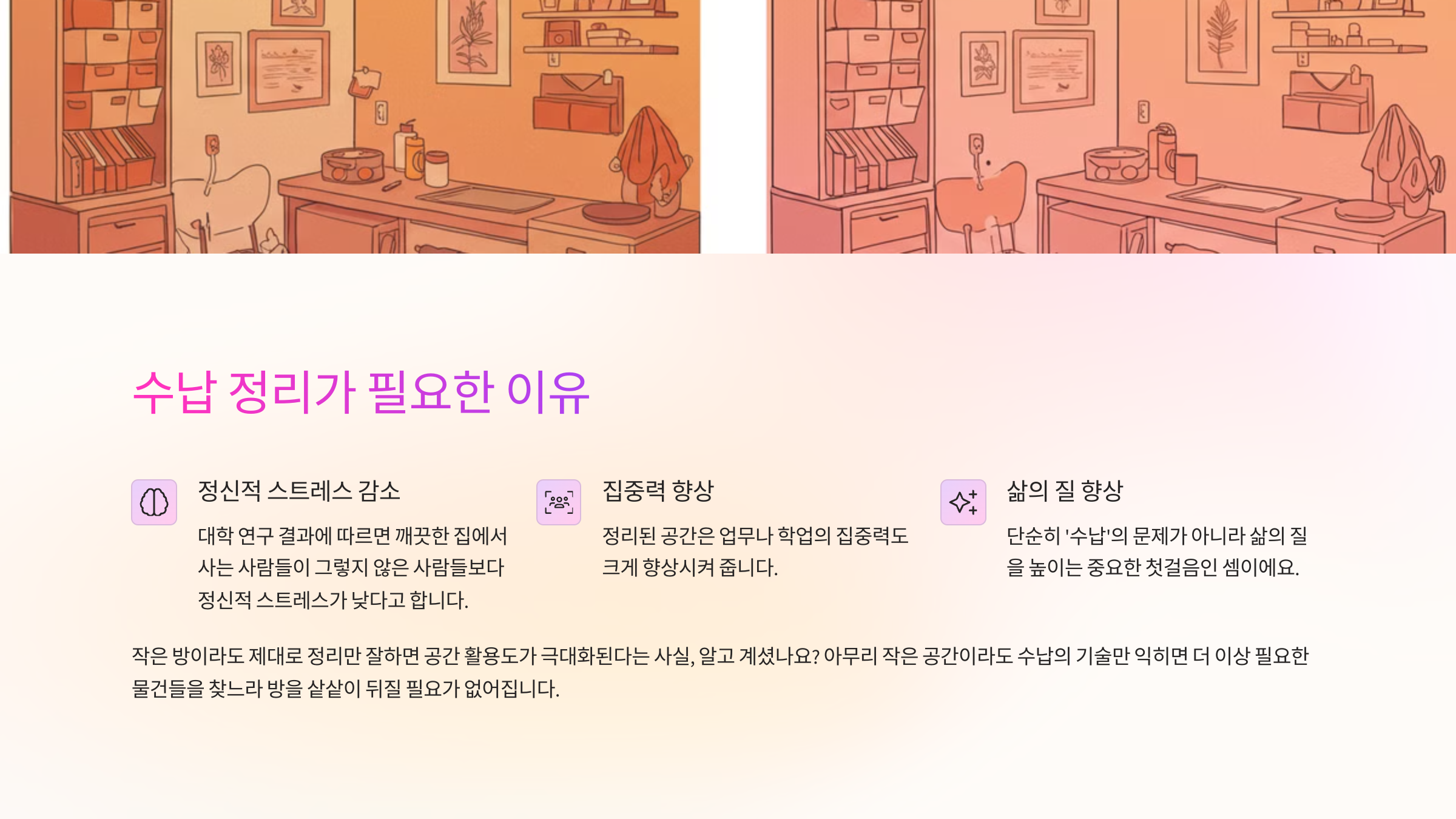 또한, 정리된 공간은 업무나 학업의 집중력도 크게 향상시켜 줍니다. 결국, 단순히 ‘수납’의 문제가 아니라 삶의 질을 높이는 중요한 첫걸음인 셈이에요.