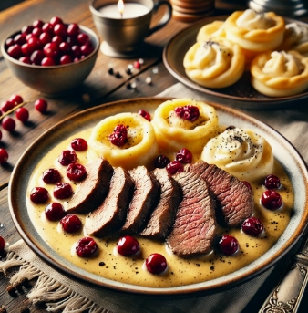 스비코바는 소고기를 크림소스와 과일 소스와 함께 부드럽게 조리한 체코 전통 요리입니다. 고기의 깊은 맛과 크림의 고소함, 그리고 과일 소스의 달콤함이 잘 어우러져 매우 풍부한 맛을 자랑합니다.