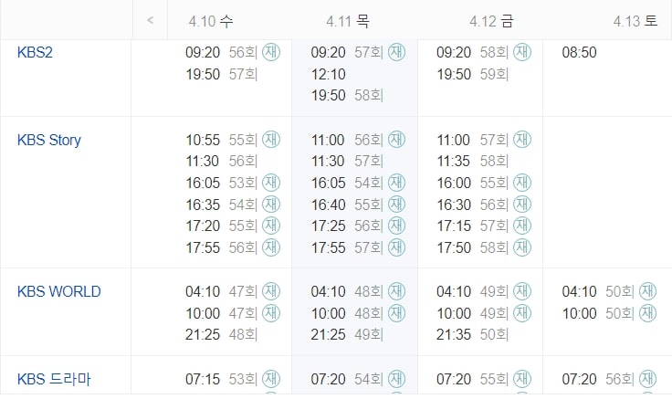 현재 드라마 재방송은 KBS, (KBS) Story/ WORLD/ 드라마 채널을 통해 편성하고 있으며 12일(금) 방송 시간을 살펴보면 49, 50, 55~58회가 09:20, 19:50 등 다양한 시간대에 방영되는 것을 알 수 있습니다.