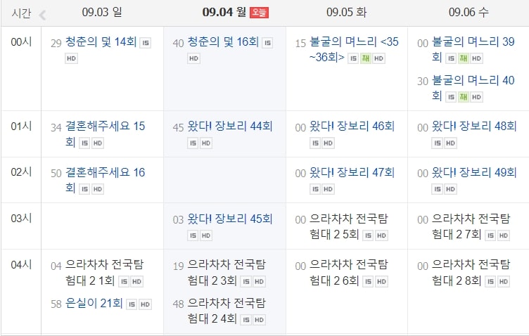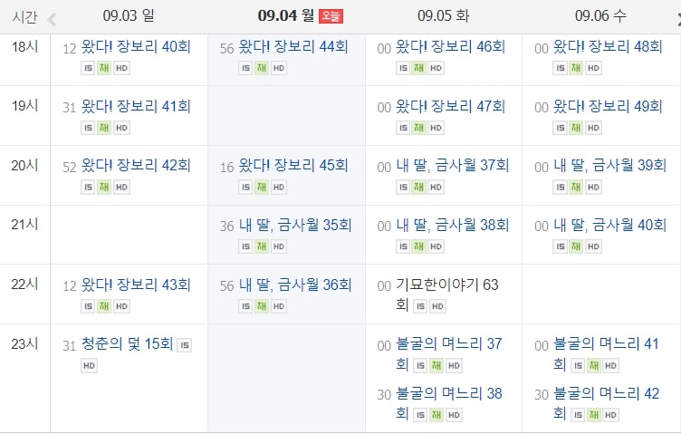 9월 3일~10일, 한 주간의 편성표를 보면 내 딸 금사월 28~44회, 청춘의 덫 14~19회, 은실이 22~32회, 왔다 장보리 40~52회가 편성되어 있어 재방송으로 시청하기에 딱 좋은 채널이기도 합니다.