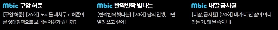 먼저 MBC에서 방영된 내딸 금사월 같은 경우 "엠빅라이브"를 통해 24시간 라이브로 시청하실 수 있는데 지금은 없지만 청춘의 덫, 왔다 장보리도 이곳에 자주 올라오는 편이며 로그인 없이도 바로 보실 수 있으니 이용하시면 됩니다. 현재 시청 가능한 드라마에는