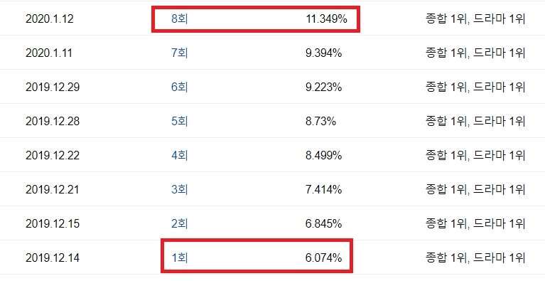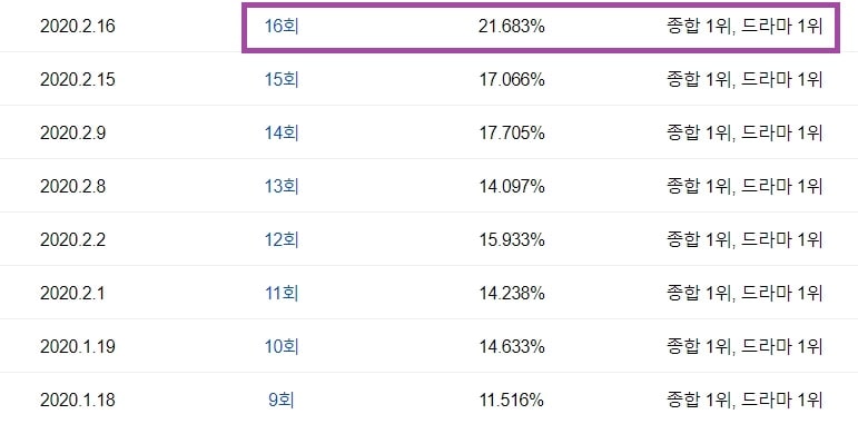 첫 방송을 6.074%로 시작해, 8회에서 10%대를 넘기며 마지막 16회 방송에서 자체 최고 시청률인 21.683%로 종영하면서
