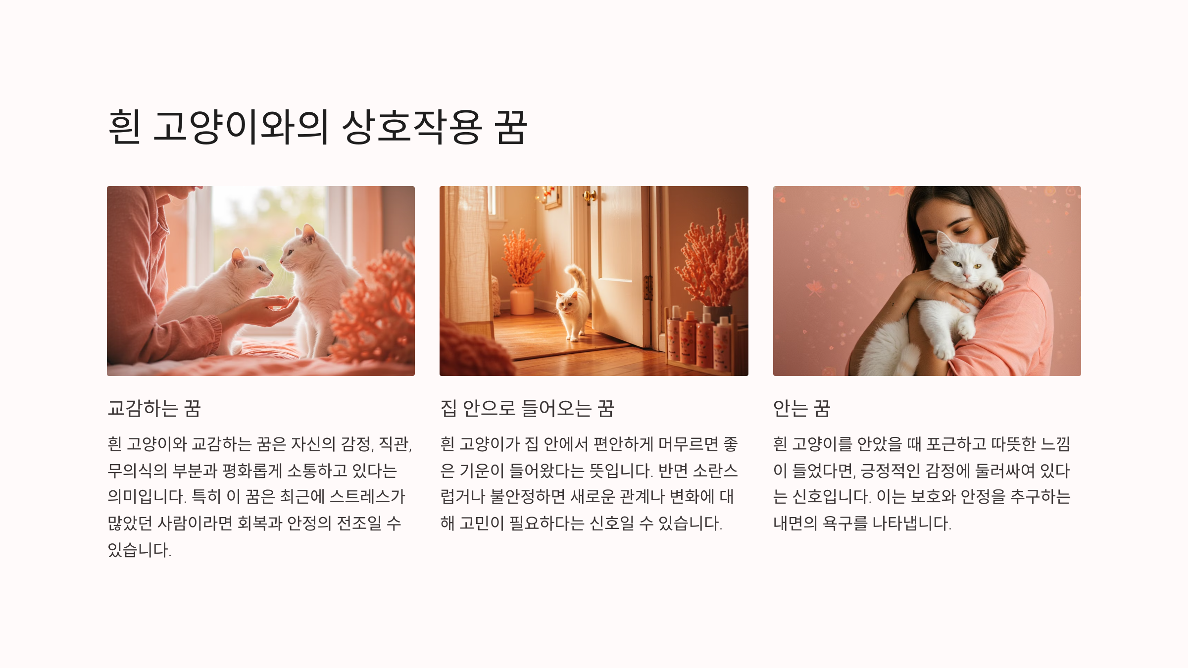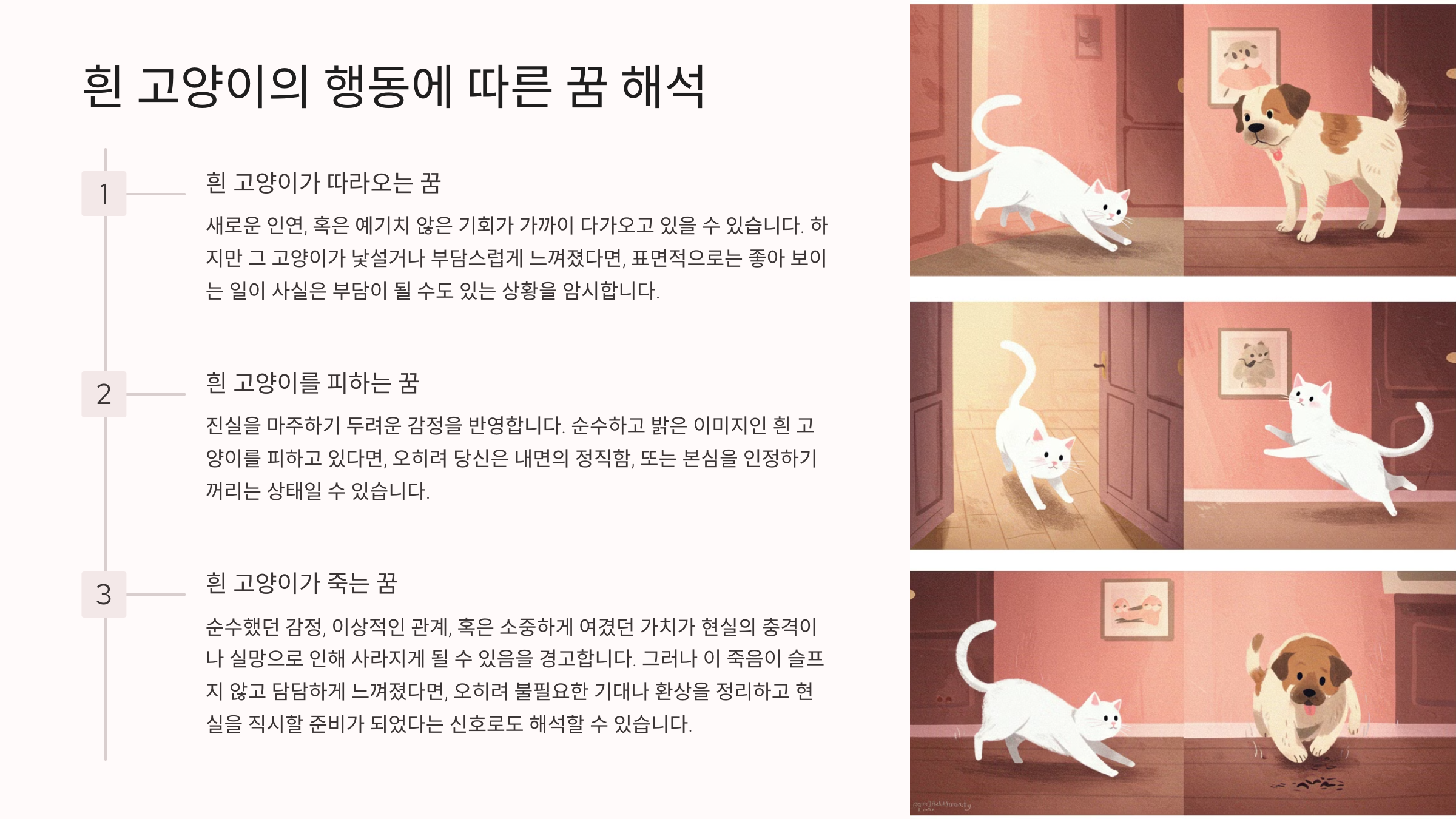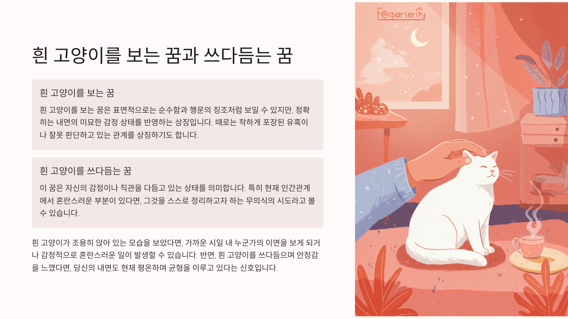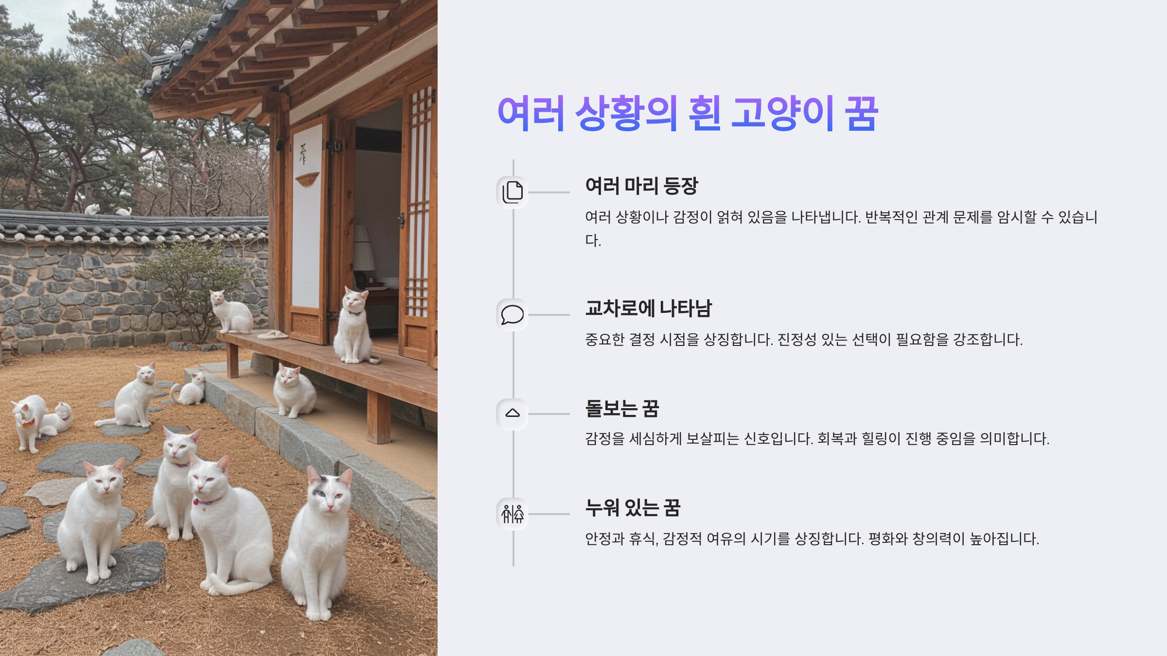 이처럼 흰 고양이 꿈은 단순히 ‘좋다’, ‘나쁘다’로 나눌 수 없으며, 꿈속에서 벌어진 상황과 느낀 감정이 해석의 열쇠가 됩니다.