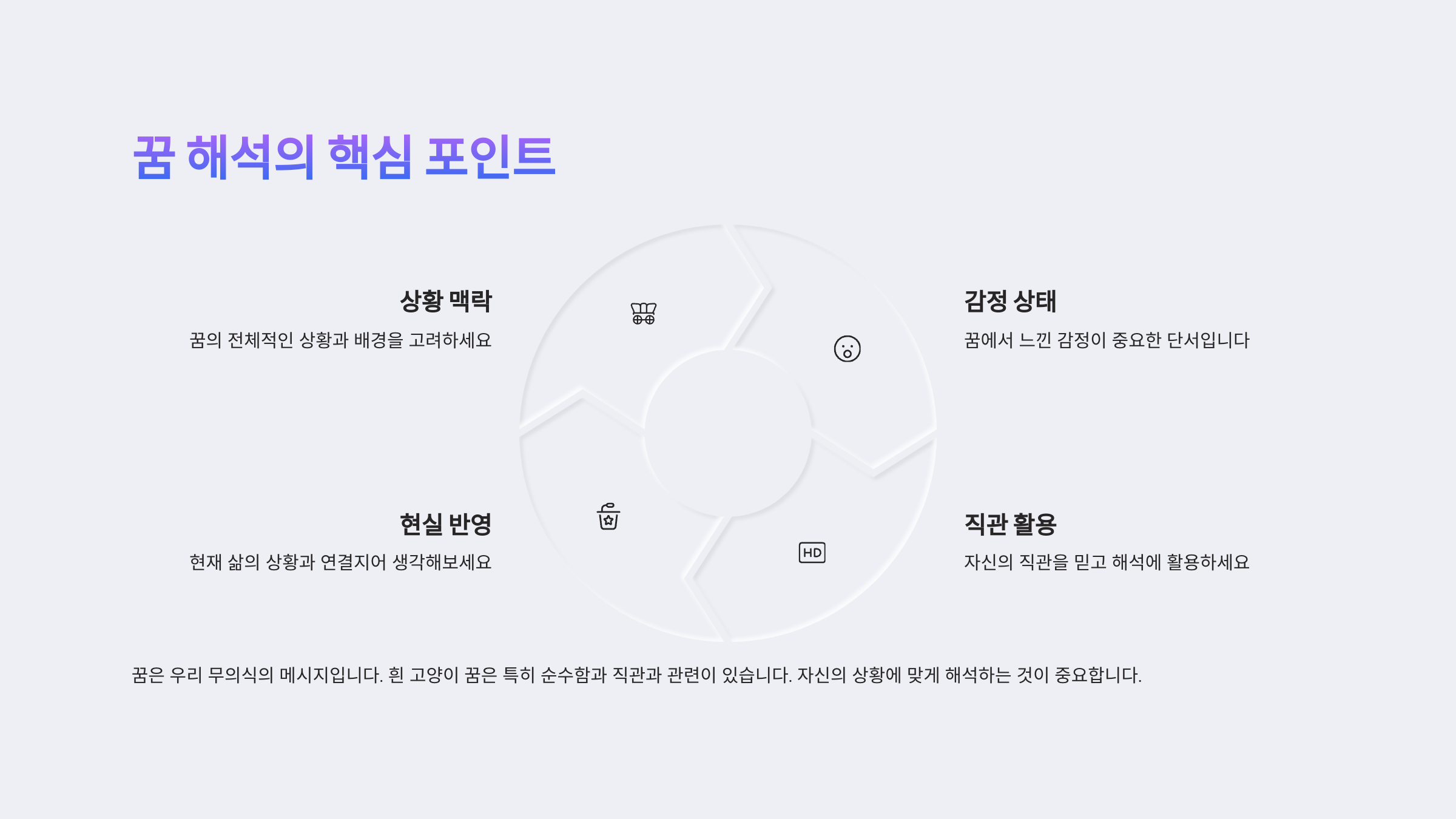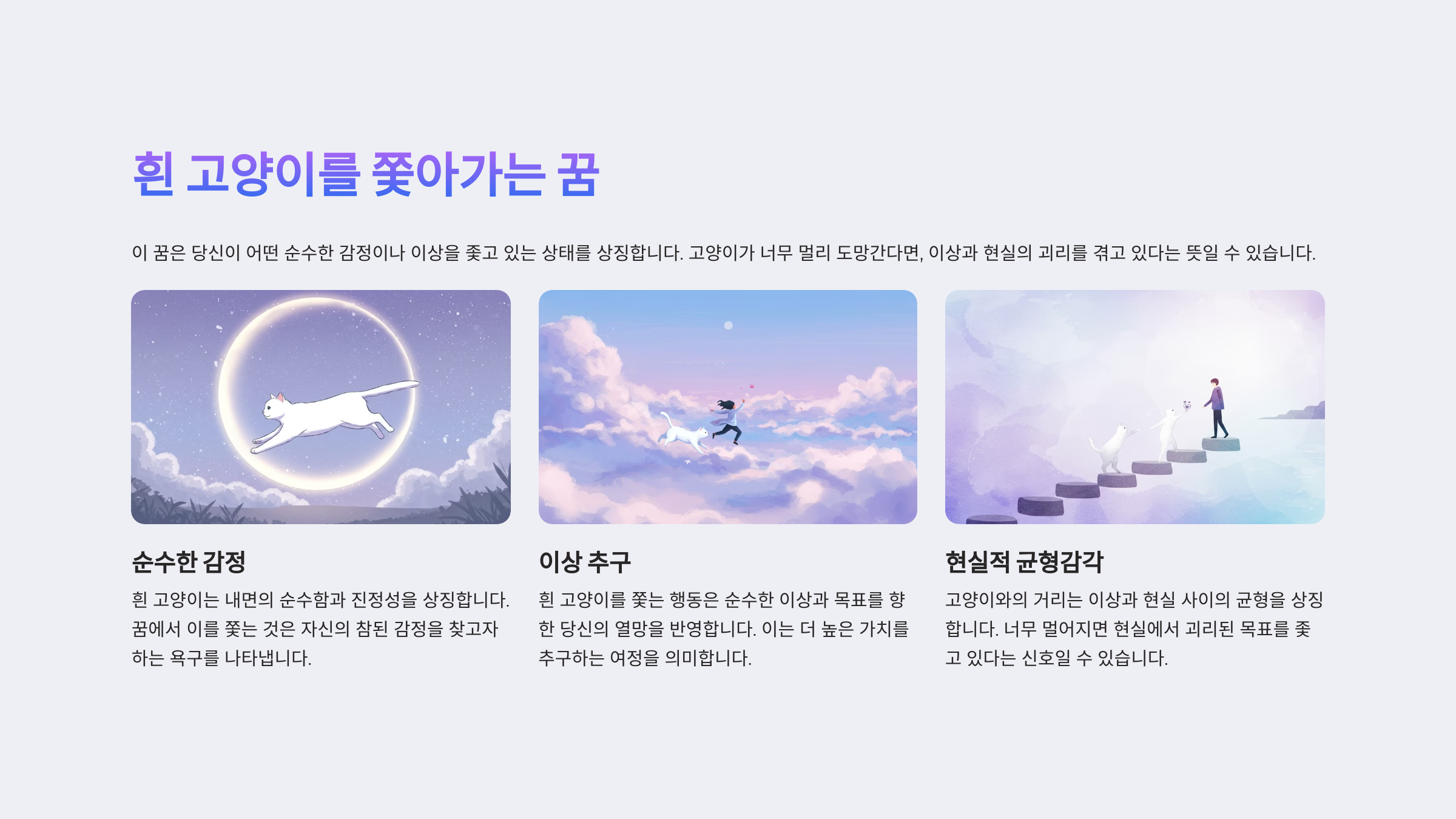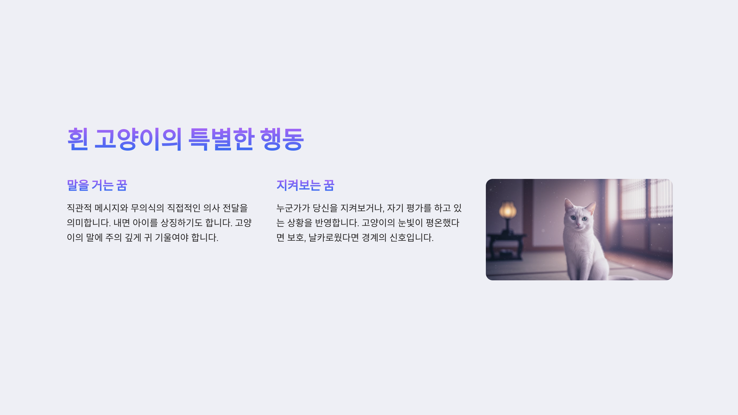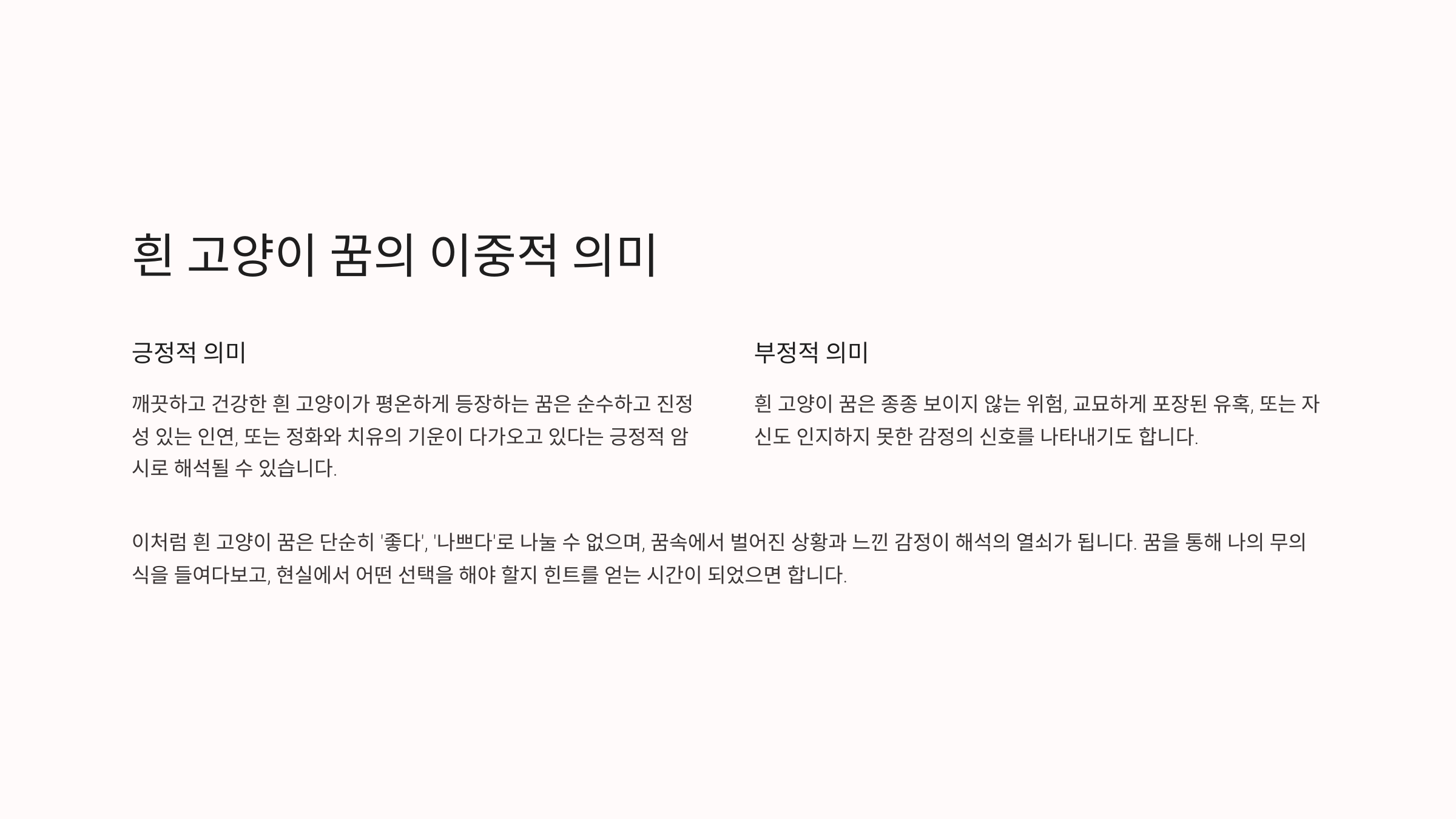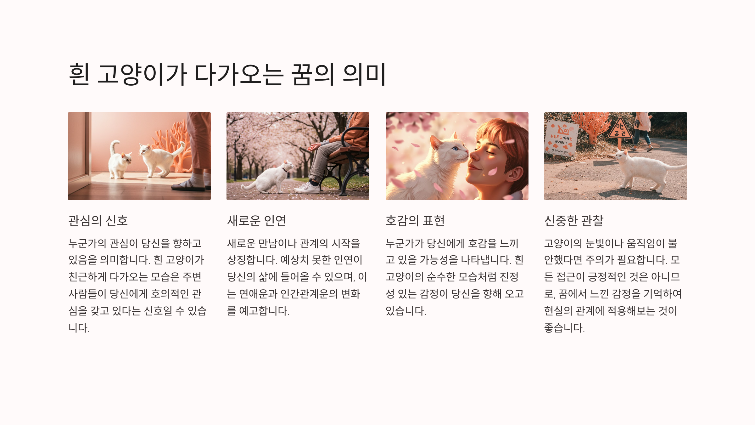 이처럼 흰 고양이 꿈은 단순히 ‘좋다’, ‘나쁘다’로 나눌 수 없으며, 꿈속에서 벌어진 상황과 느낀 감정이 해석의 열쇠가 됩니다.