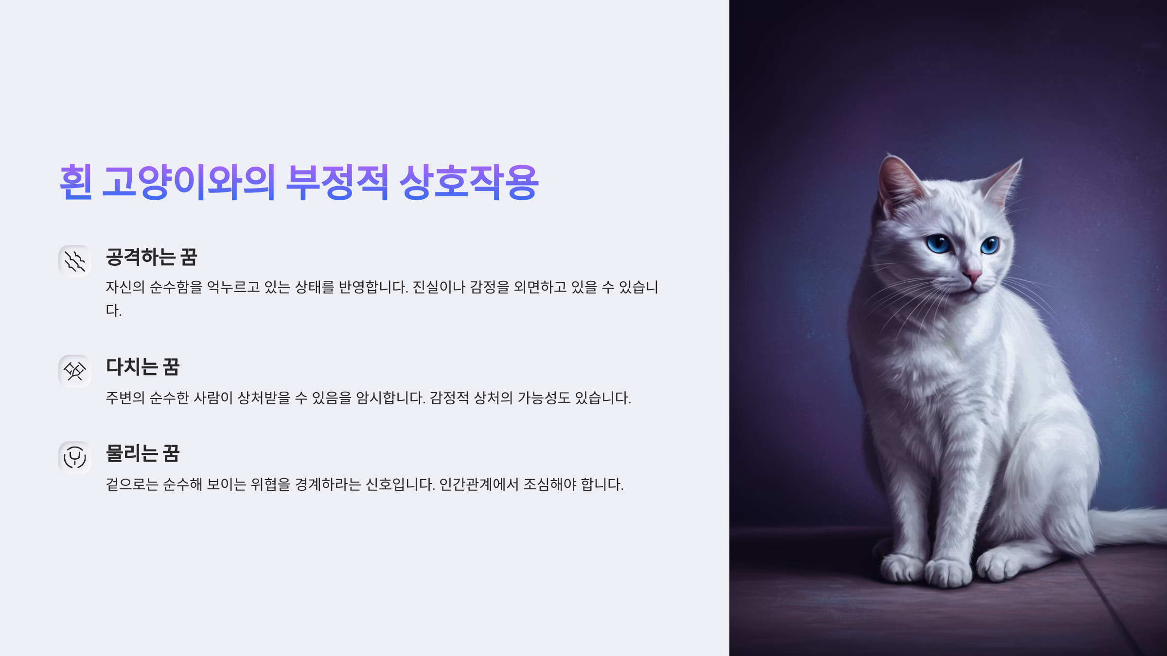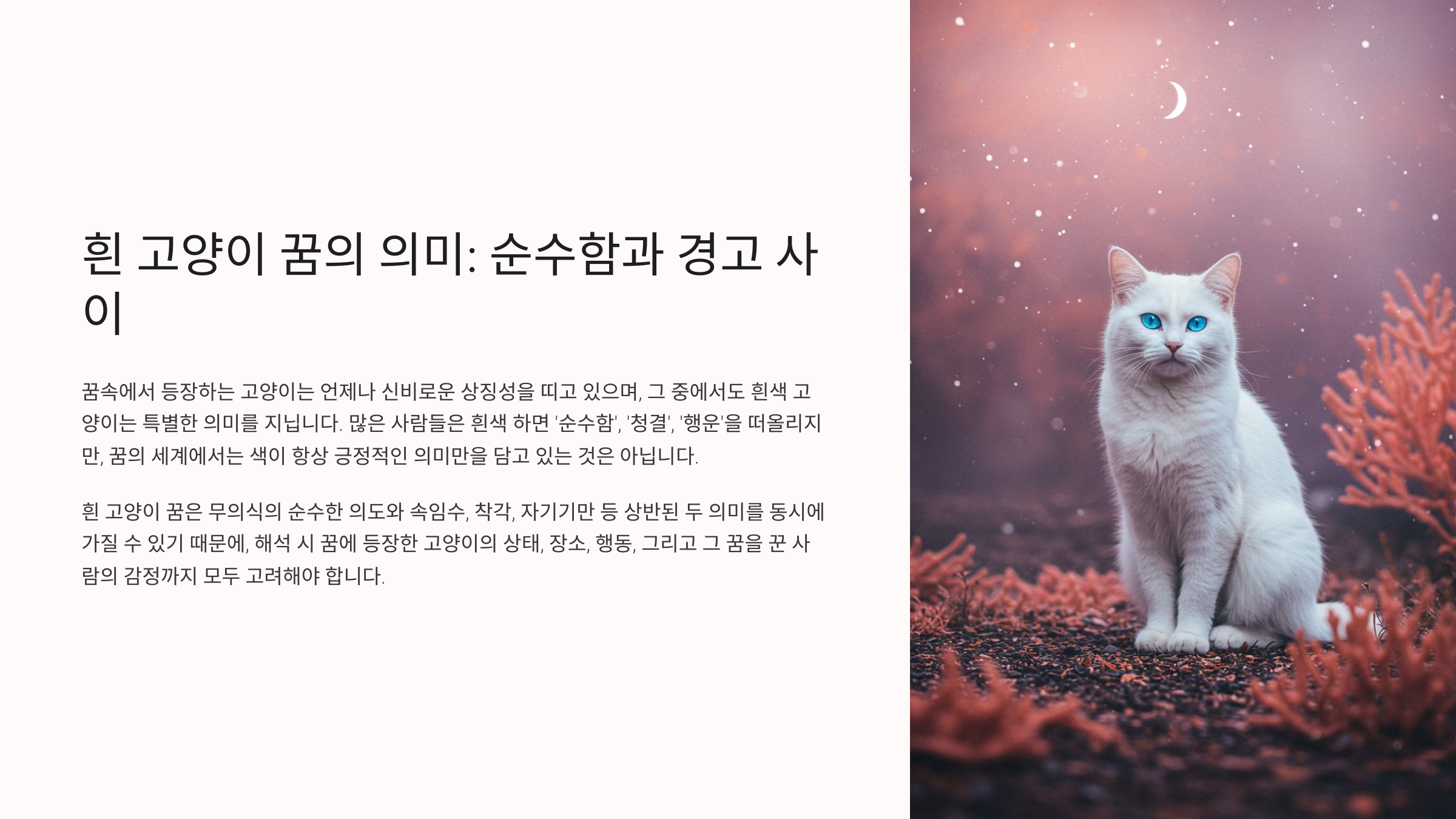 흰 고양이를 보는 꿈은 표면적으로는 순수함과 행운의 징조처럼 보일 수 있지만, 정확히는 내면의 미묘한 감정 상태를 반영하는 상징입니다. 흰 고양이는 때로 착하게 포장된 유혹, 또는 자신이 잘못 판단하고 있는 관계나 상황을 상징하기도 합니다.