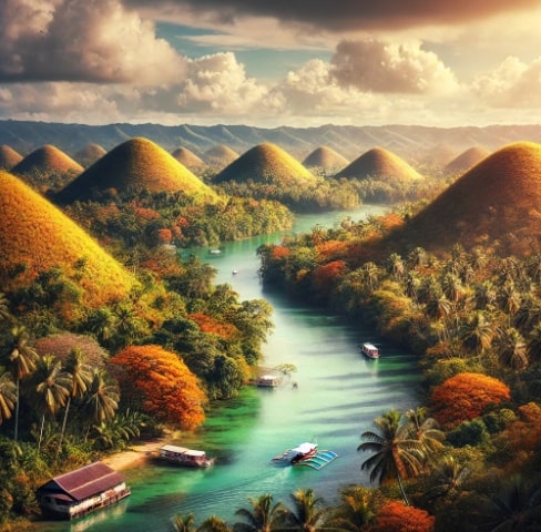 보홀은 필리핀의 자연적인 아름다움을 그대로 보여주는 곳으로, 이곳의 풍경은 그야말로 장관인데, 초콜릿 힐은 보홀의 상징적인 관광지로, 초록색 언덕들이 끝없이 펼쳐져 있어 마치 초콜릿 봉우리처럼 보입니다.