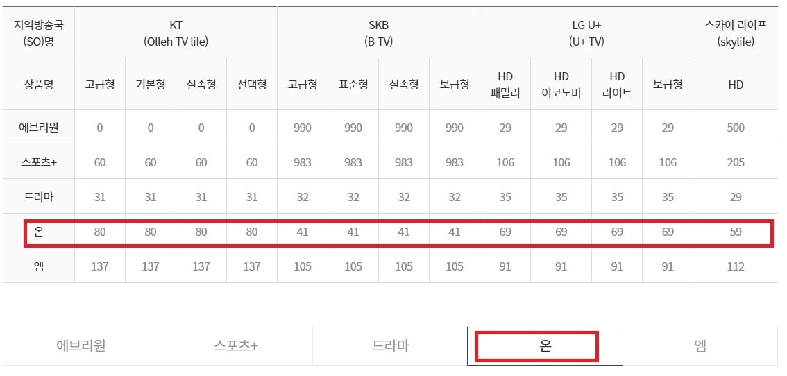 KT, SKB, LG U+, skylife를 이용하시는 분들은 아래 이미지를 통해 확인하시고 지역 케이블을 이용하시는 분은 아래 홈페이지에 방문 중간쯤에 있는 "채널 번호"를 선택한 후 "온"을 누르시고 지역 케이블 번호를 확인하신 후 시청하시면 됩니다.